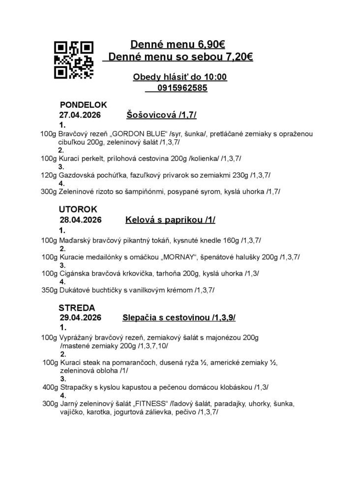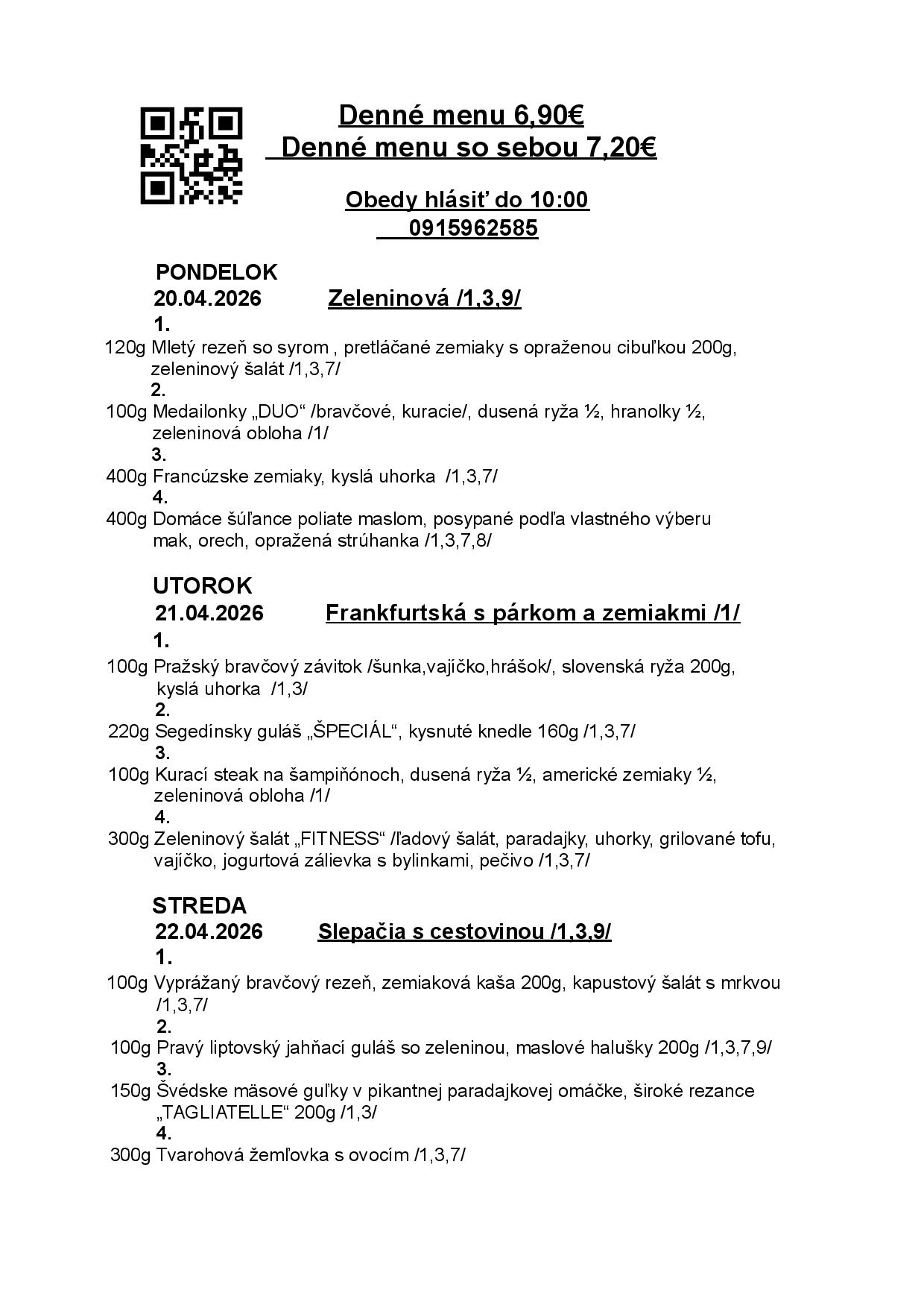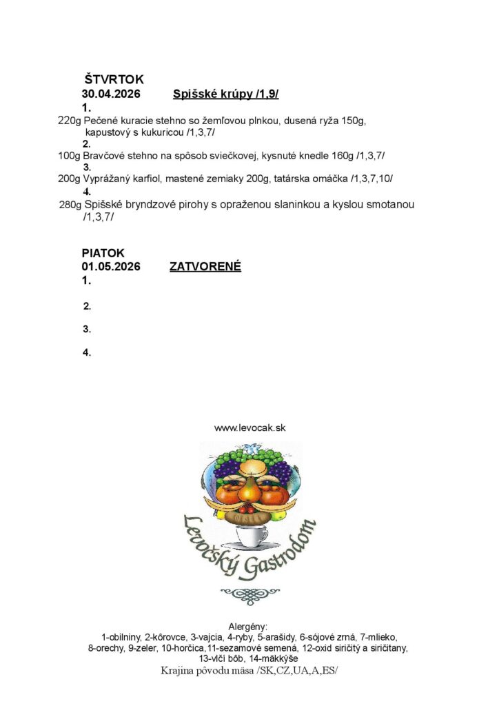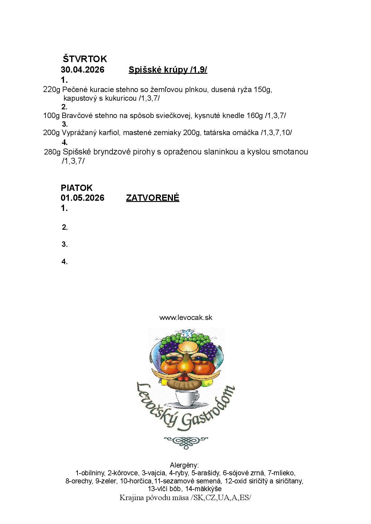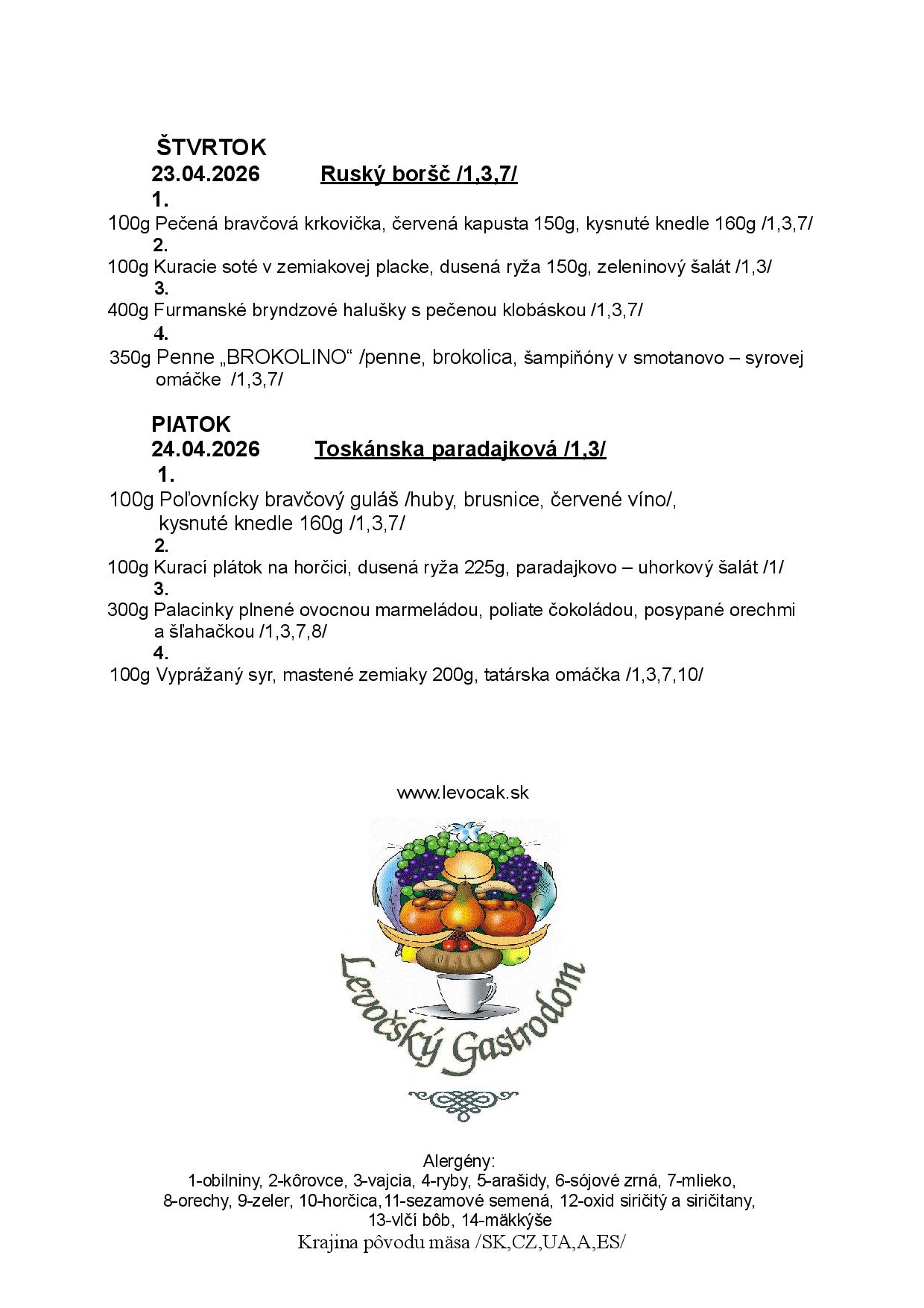 Navštívte nás priamo na námestí mesta Levoča, kde si počas pracovných dní od 10.00 - 13.30 hodiny môžete vybrať z jedálneho lístka:
